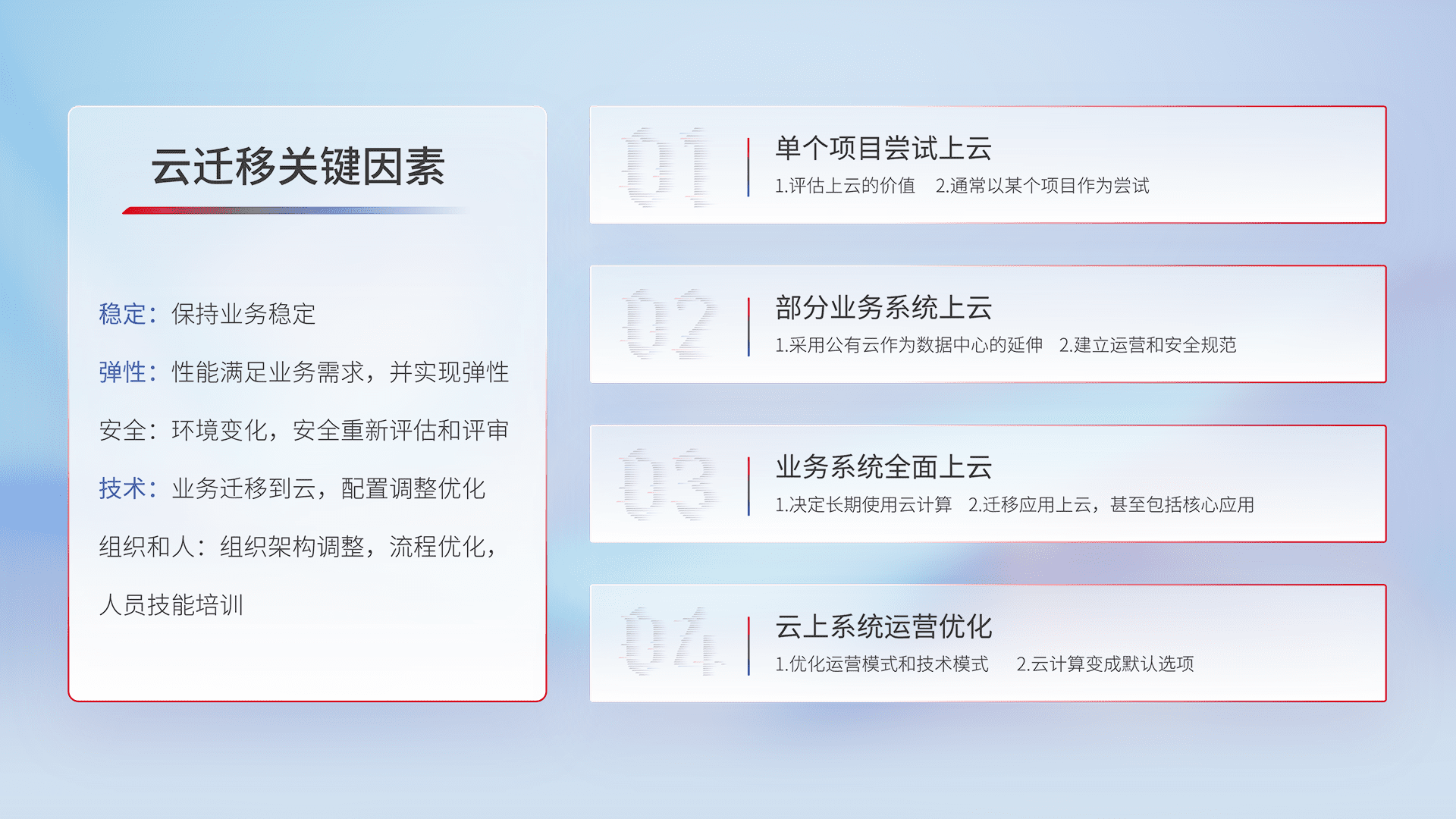 结合实际业务,,,从规划设计、、、云平台选型、、、云原生改造、、、数据迁移、、、集成交付,,,,迁移全过程为客户识别最佳上云路径,,做好风险识别管理,,,,设计网络架构、、、身份权限、、、、安全审计合规、、、、操作审计、、、日志审计、、监控告警策略、、、、多站点容灾设计等,,,,对云上基础设施进行整体规划,,提升IT治理水平,,以满足弹性、、高可用、、、高性能的需求。。。